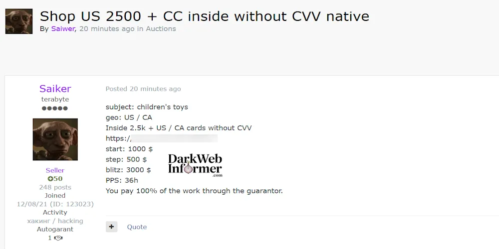 A Threat Actor is Claiming to Auction Brazil Credit Card Details