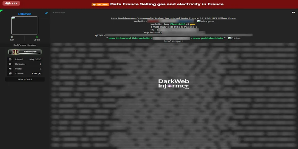 A threat actor using the alias icikevin has claimed to possess and is actively selling a database allegedly stolen from TotalEnergies Power & Gas, a major energy provider in France. The dataset is said to contain over 22.25 million lines of sensitive customer information, including names, phone numbers, addresses, energy usage categories, and tariff structures.