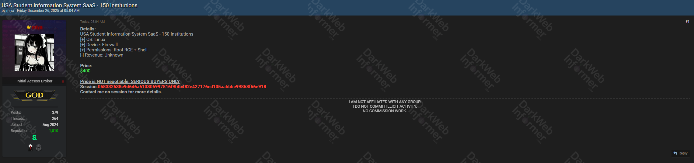 The threat actor "miya" claims to be selling initial access to a U.S.-based Student Information System (SIS) SaaS platform used by approximately 150 educational institutions.