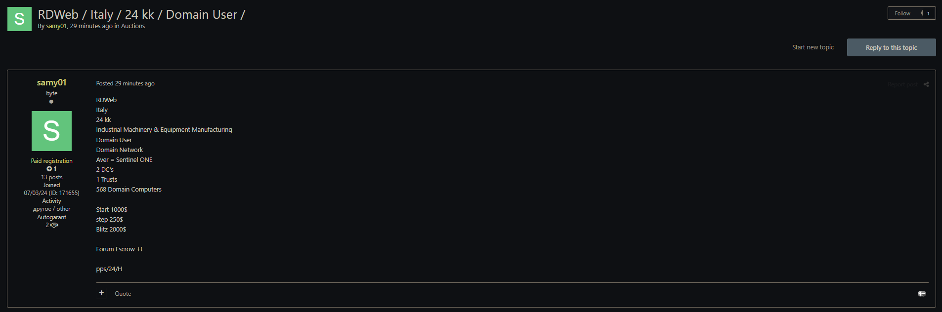 A threat actor identified as samy01 has posted an auction for unauthorized RDWeb access to an unidentified industrial machinery and equipment manufacturing company in Italy. The listing, posted on a known cybercrime forum, describes domain-level access to a sizable internal network, including domain controllers, trusted relationships, and SentinelOne-protected endpoints.
