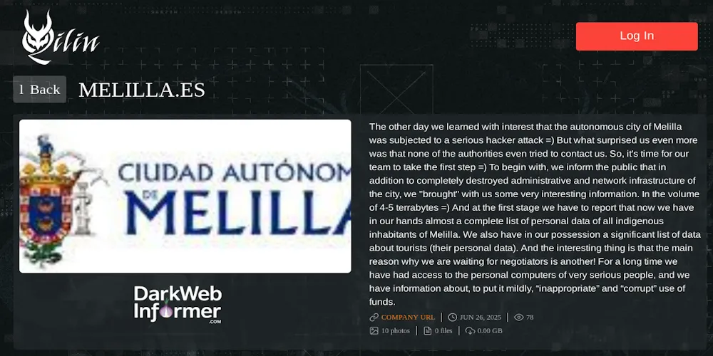 On June 26, 2025, the ransomware group Qilin announced an attack against the Autonomous City of Melilla, a Spanish government entity. According to Qilin, the group exfiltrated between 4–5 terabytes of sensitive information and disrupted administrative and network systems. The claim includes possession of the full personal data of all indigenous inhabitants of Melilla, as well as personal data on tourists and internal government communications. The leak was presented as a response to authorities allegedly ignoring prior contact attempts.