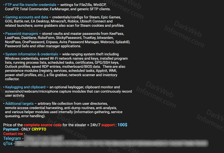 A threat actor going by Jaxx is selling the complete source code for a C# infostealer called Azury, described as a semi-FUD (fully undetectable) stealer built over two months of development. The package includes the stealer itself and a dedicated C# operator panel for managing infected machines, for $100.