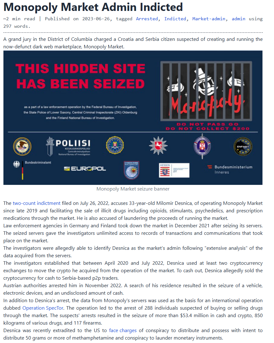~2 min read | Published on 2023-06-26, tagged Arrested, Indicted, Market-admin, admin
