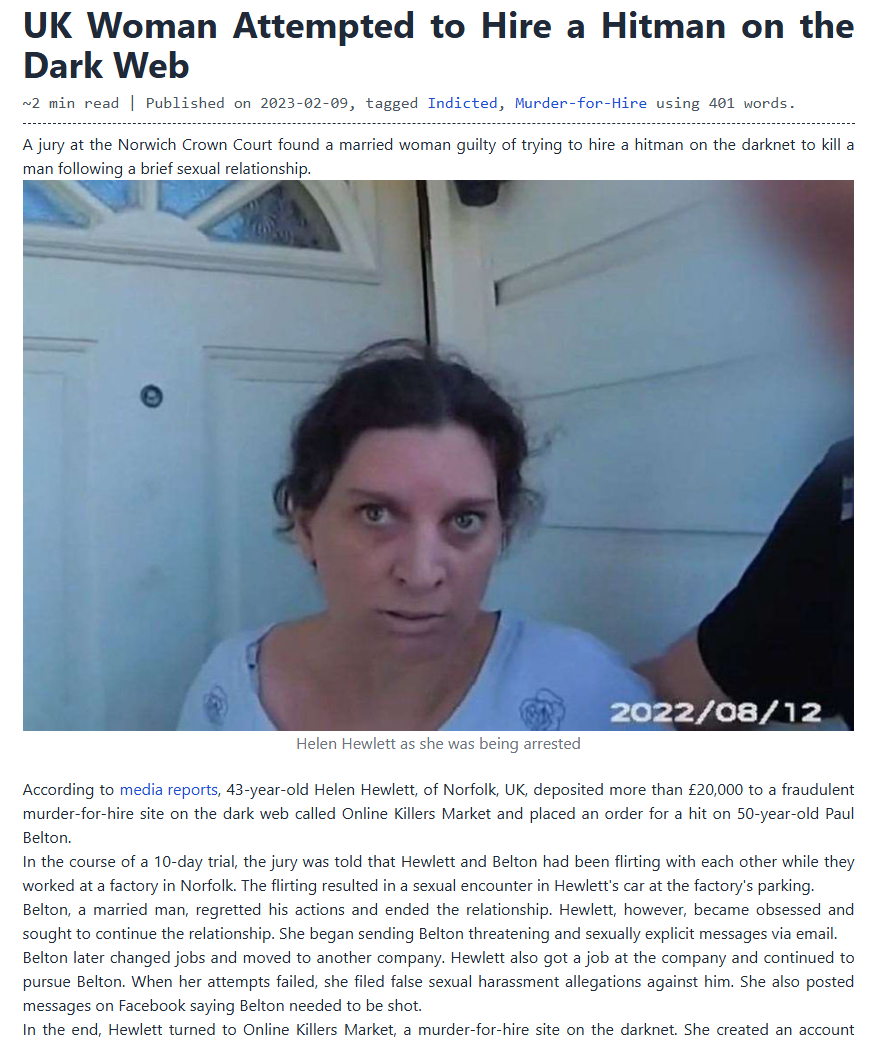 According to media reports, 43-year-old Helen Hewlett, of Norfolk, UK, deposited more than £20,000 to a fraudulent murder-for-hire site on the dark web called Online Killers Market and placed an order for a hit on 50-year-old Paul Belton.