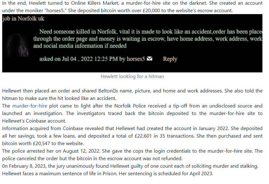 In the end, Hewlett turned to Online Killers Market, a murder-for-hire site on the darknet. She created an account under the moniker "horses5." She deposited bitcoin worth over £20,000 to the website's escrow account.