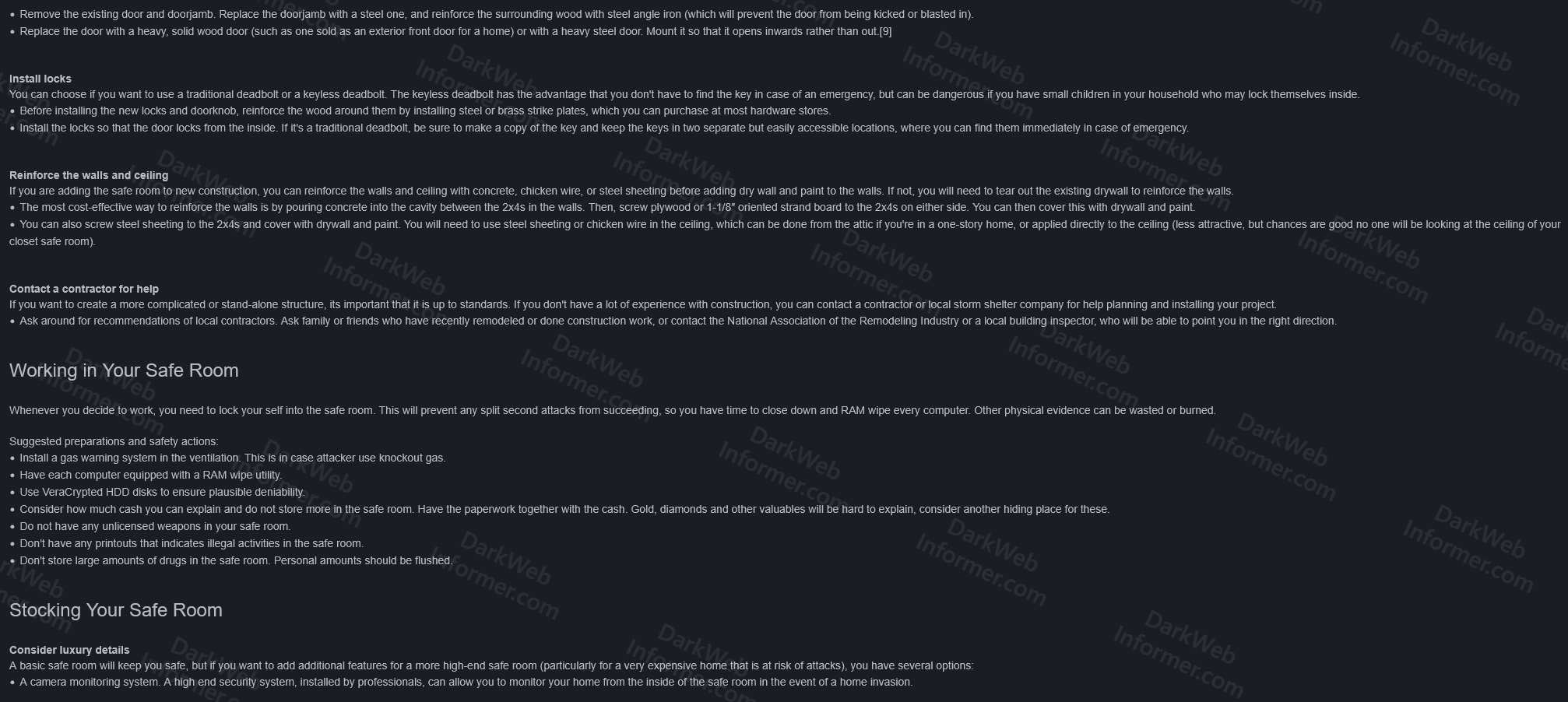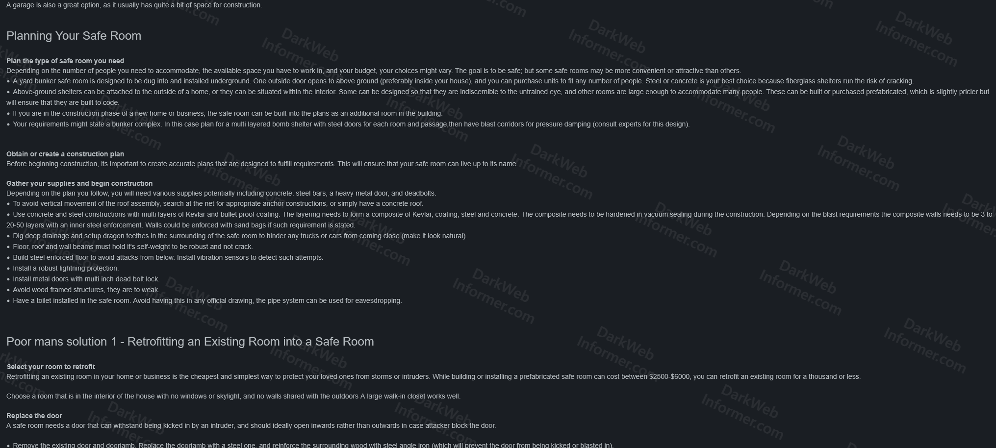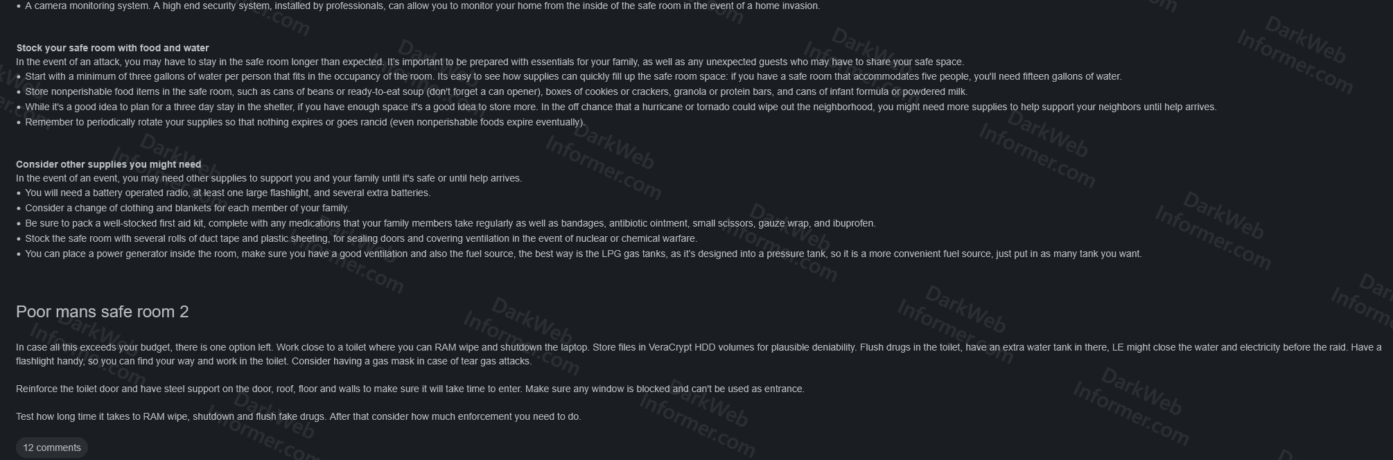 This Dread thread discusses safe room planning guide presenting itself as preparation advice for extreme threat scenarios. The guide systematically addresses threat assessment, strategic room positioning, structural fortification, ventilation systems, power backup, communication infrastructure, and perimeter monitoring capabilities. Drawing from publicly available resources including FEMA documentation, the content emphasizes hardened construction techniques utilizing concrete, steel reinforcement, fortified entry points, and strategic placement in interior or subterranean locations to minimize vulnerability.