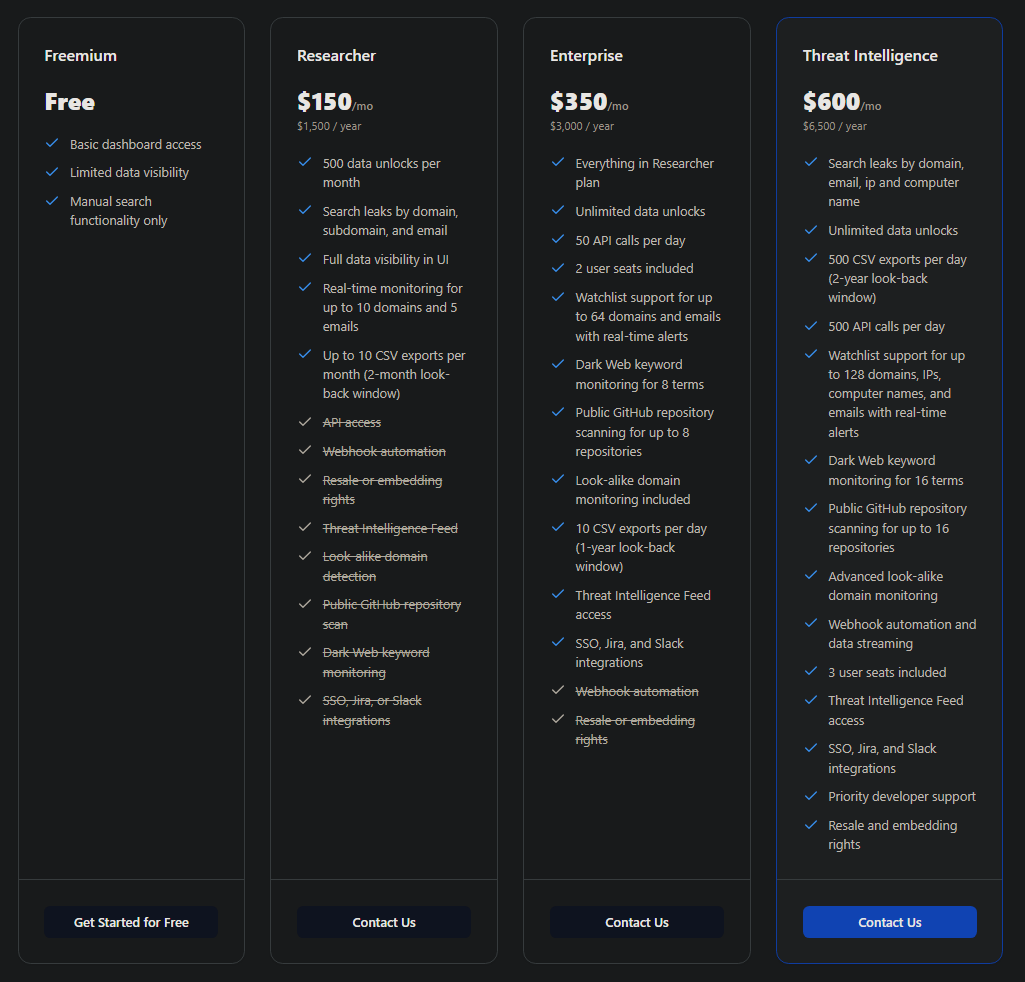 Whiteintel offers several subscription plans, tailored to your data and API access needs. Comprehensive information is provided on their pricing page.