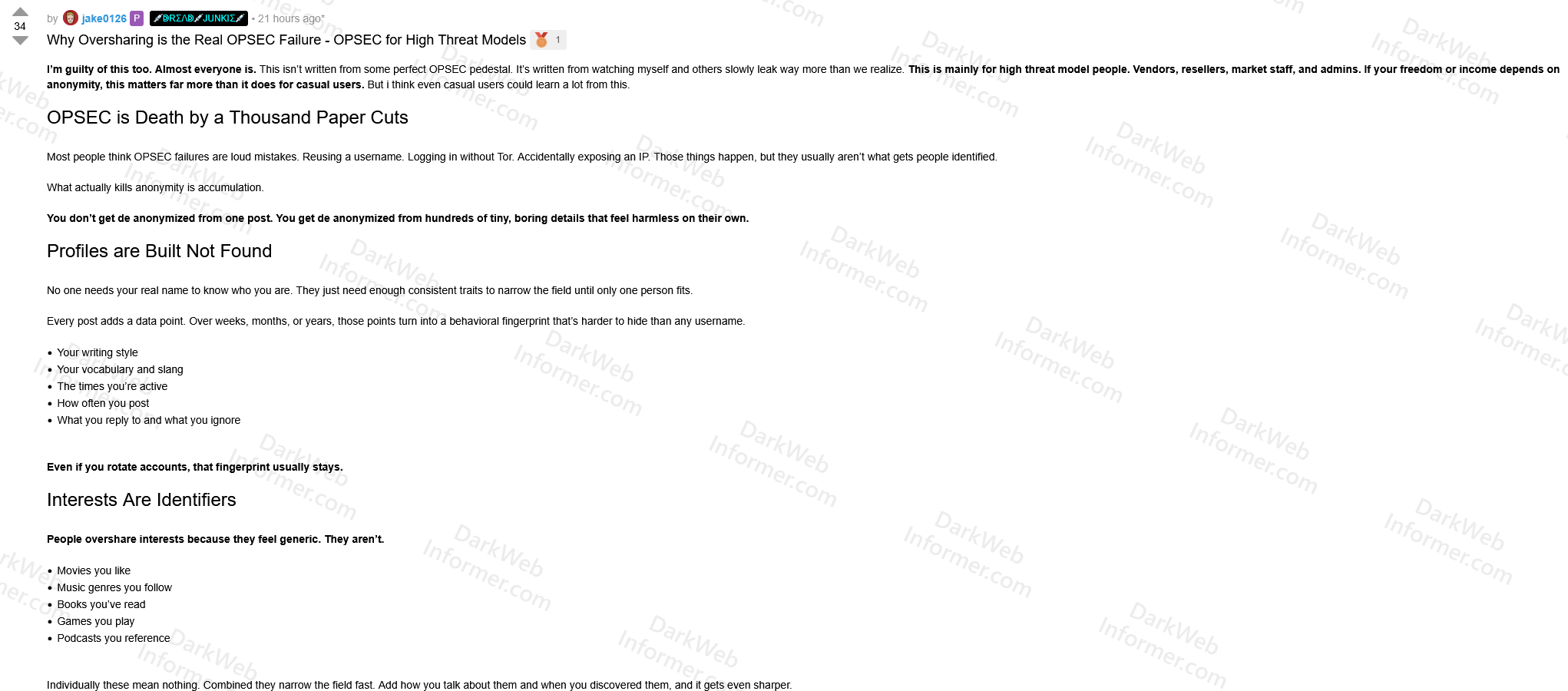 Compare that with admins who lived on Dread. The Archetyp admin posted constantly and revealed far too much over time. His tone, habits, beliefs, and reactions became familiar.