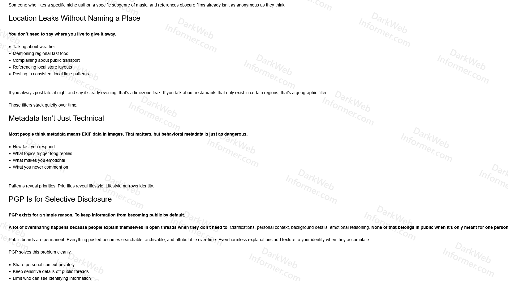 If you always post late at night and say it’s early evening, that’s a timezone leak. If you talk about restaurants that only exist in certain regions, that’s a geographic filter.