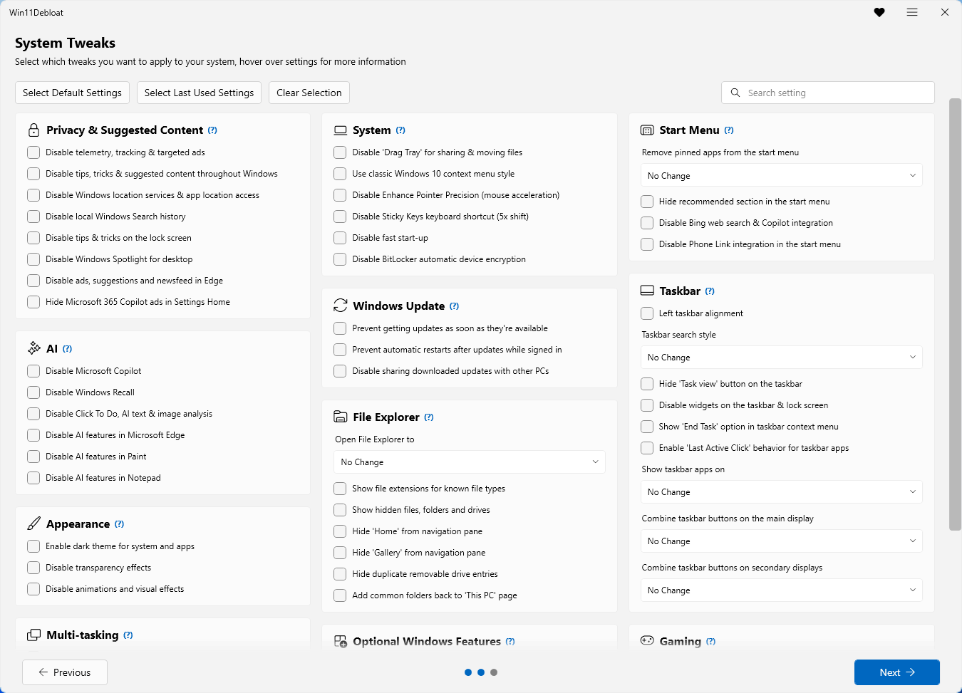 A fresh Windows installation in 2026 comes with Copilot, Recall, Click to Do, Bing web search baked into the Start menu, telemetry phoning home, widgets on the taskbar, ads in the Settings app, Candy Crush in the Start menu, and a collection of pre-installed apps that most people never asked for. Microsoft continues to add features that blur the line between operating system and advertising platform, and users continue to look for ways to undo it.