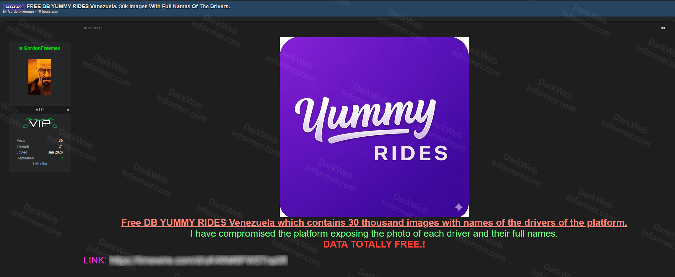 A threat actor going by GordonFreeman claims to have compromised the Yummy Rides platform in Venezuela and leaked a database containing approximately 30,000 driver photos along with their full names. Yummy Rides is a Venezuelan ride-hailing and delivery service. The data has been made available as a completely free download with a direct link.